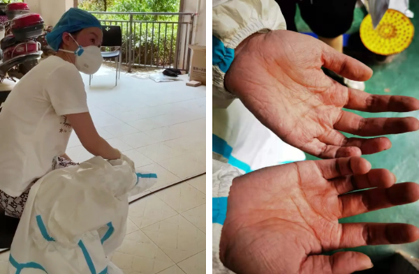 在长沙某小区 ,一名采样人员出现中暑症状;zoty中欧采样人员双手被汗水泡得发白、发皱