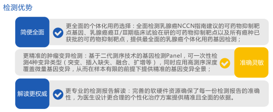 乳腺癌/卵巢癌个体化用药基因检测综合NCCN临床指南推荐的检测基因以及中国人常见的乳腺癌/卵巢癌驱动基因,采用高通量测序技术,针对HER2、BRCA1/2、CDK4/6等多个基因进行检测,精准分析乳腺癌/卵巢癌患者体内相关基因突变信息,从而指导患者和医生进行靶向药物治疗。